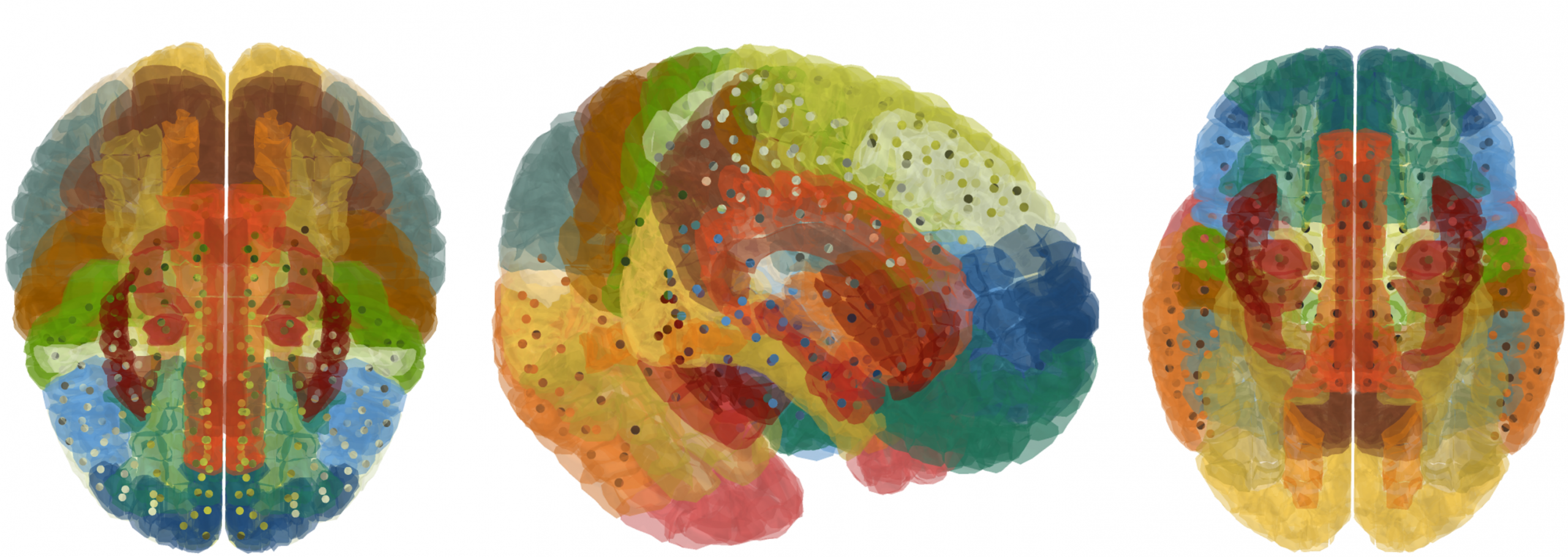 This figure shows the location of Infantile Neuroaxonal Dystrophy within the brain. Different colors represent various brain regions according to their labels, while the points indicate areas with a potential presence of Infantile Neuroaxonal Dystrophy.