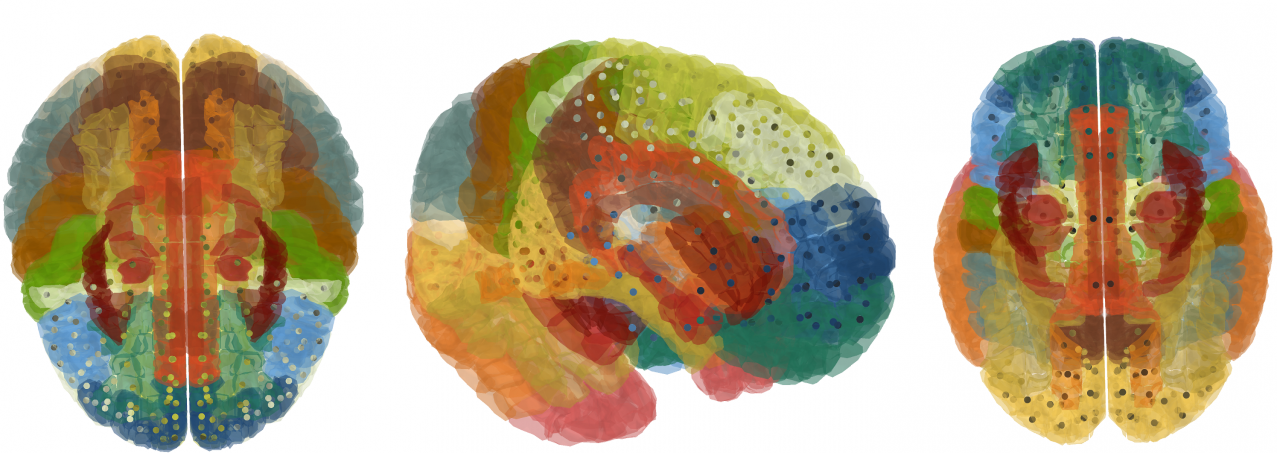 This figure shows the location of Pelizaeus-Merzbacher Disease within the brain. Different colors represent various brain regions according to their labels, while the points indicate areas with a potential presence of Pelizaeus-Merzbacher Disease.