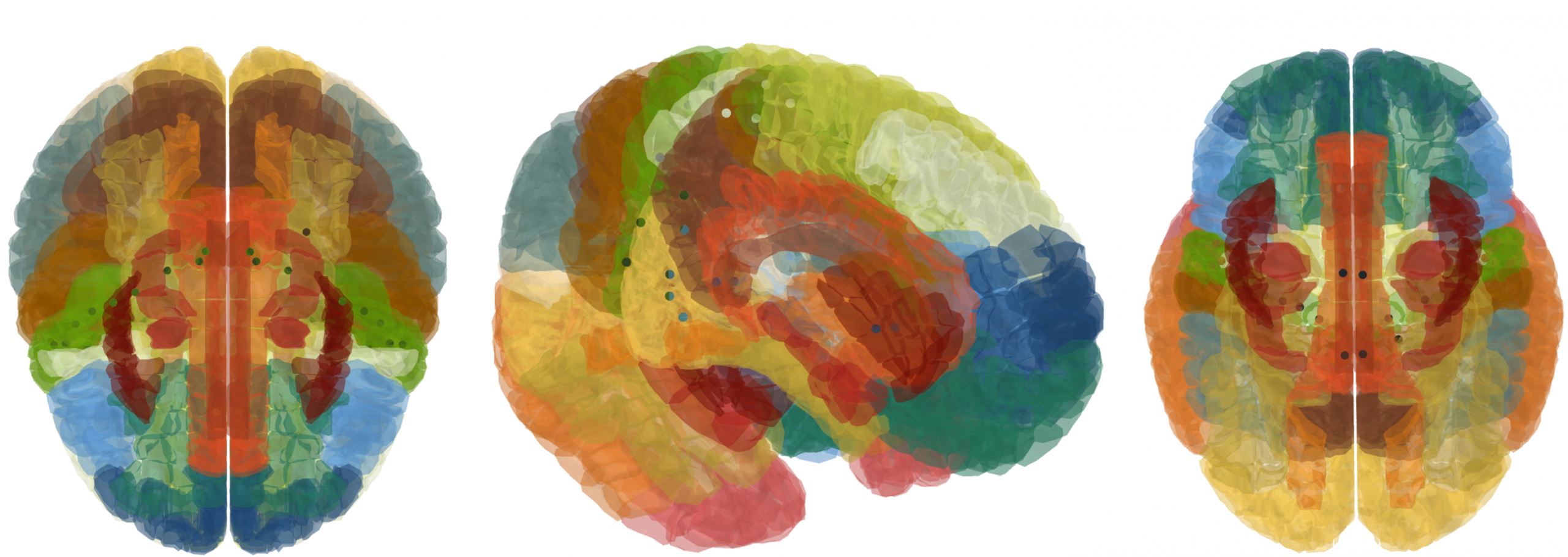 This figure shows the location of Spinal Muscular Atrophy within the brain. Different colors represent various brain regions according to their labels, while the points indicate areas with a potential presence of Spinal Muscular Atrophy.