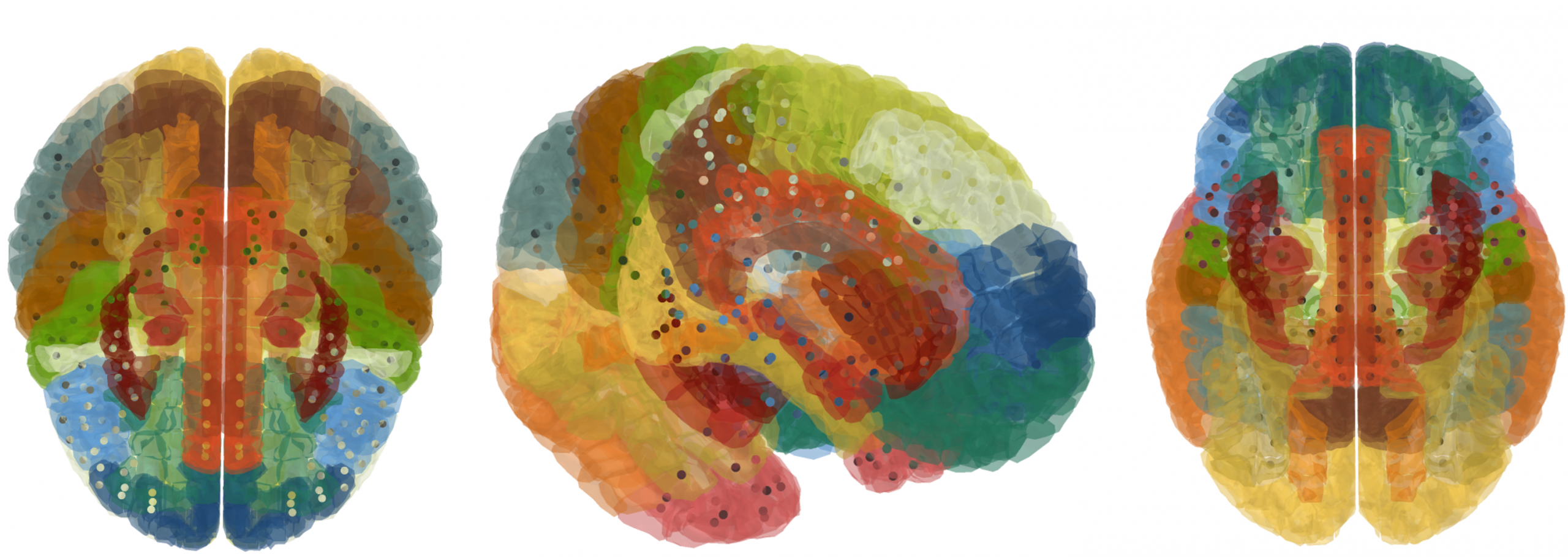 This figure shows the location of Spinocerebellar Ataxia within the brain. Different colors represent various brain regions according to their labels, while the points indicate areas with a potential presence of Spinocerebellar Ataxia.